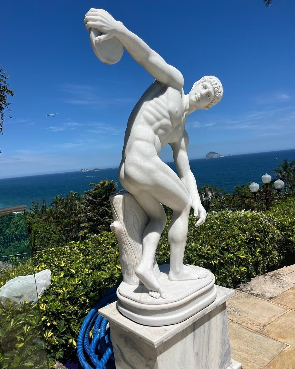 Esculturas em mármore e bronze são especialmente valorizadas por transmitirem tradição, durabilidade e alto padrão.